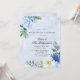 Design features a printed coloured with floral element in shades of dusty blue and navy over greenery leaves and peony rose blooms. on a light blue watercolor background.. Great for your wedding celebrations!
