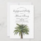 A beach inspired engagement party invitation featuring a watercolor image of a single coastal palm tree. On the side of it are your unique party details.
