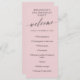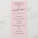 A dusty pink birthday party program with elegant fonts and a delicate calligraphy script writing welcome across the top of the program. Add your program, the date, and the name of the person celebrating their birthday. Clean, simple, timeless, and elegant.