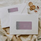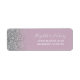 The left-hand edge of this elegant modern wedding return address label features a silver faux glitter design. The customisable text combines white handwriting and copperplate fonts on a dusty lavender purple background.