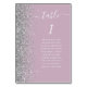 The left-hand edge of this elegant modern wedding table number card features a silver faux glitter border. The word "table" appears in white whimsical handwriting script on a dusty lavender purple background. Add the names of your guests who are assigned to each table.