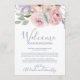 These dusty rose florals welcome letter & itinerary cards are perfect for a spring or summer wedding. The romantic floral design features lilac purple, blush pink and peach flowers arranged in a gorgeous soft pastel bouquet. The front of the card features a welcome letter and the back of the card features the wedding itinerary. These notes are perfect for destination weddings and hotel guest welcome bags.
