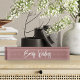 Elegant desk nameplate features your name, title, or choice of personalisation in white hand scripted cursive lettering on a dusty rose mauve pink background.