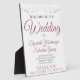 This beautiful self standing sign or plaque will welcome guests to your wedding ceremony. Fully customisable, it features a simple yet elegant design with dusty rose or mauve pink & Grey text on a white background with a silver faux foil floral border.