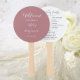 Wedding day program printed on a round style hand fan that features a trendy, dusty rose colour background on the front side with the bride and groom names in white, stylised script. Back side of program lists the wedding party participants and ceremony rites on a white background with dark grey lettering. Edit hand fan and replace wedding program info with your own. Perfect for an indoor or outdoor wedding ceremony! Select number of hand fan programs desired.