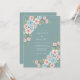 This design features a serene dusty teal background adorned with soft pink cherry blossoms and light blue roses. The watercolor aesthetic creates a romantic and airy mood perfect for a springtime theme. Elegant sage green leaves weave through the floral clusters, adding a touch of nature-inspired beauty.