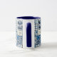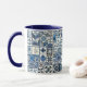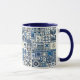 White and navy blue 11 oz. combo mug with an image resembling ceramic, tin-glazed Delft Dutch tiles.