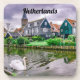 Painting of traditional wooden fishing houses, canal and swan in Marken, Netherlands. View of canal, bridge and traditional fishing houses in waterland village. Traditional Holland symbols.