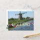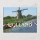 Dutch Windmill Ducks Postcard. A postcard of a windmill in a flat green rural polder landscape, with sweet little ducks swimming in the water of the canal with green lilypads, on a beautiful blue clear summer sky in The Netherlands (Holland).