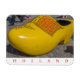 A close up photograph of a traditional wooden clog in Holland printed on a souvenir fridge magnet.