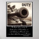 A close-up of a tank's cannon, its massive barrel a silent watcher over a desolate landscape, fills the frame. The shallow depth of field highlights the cannon's intricate details and rugged texture. The background is a muted, dusty expanse with soft, sepia tones, creating a powerful yet serene ambiance. The word "Duty" appears at the top centre in a bold, stylised, elegant cursive font, framed by a black border. The tank's presence exudes strength and unwavering resolve.! The liberties of our country, the freedom of our civil Constitution, are worth defending at all hazards; and it is our duty to defend them against all attacks." -Samuel Adams