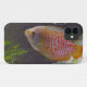The original photograph on this case shows a Dwarf Gourami fish swimming in an aquarium. This colourful tropical fish has an orange body with vertical stripes that look iridescent light blue in sunlight. Green leaves of an underwater plant can be seen in one corner of the photo, part of a large seashell in another corner behind the fish, and the background is a textured medium grey.