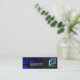 Card features a dark grey cover accentuated by an underlying global blue polygon shape imprint. A grey strip in the blue globe houses your prestigious name and job title. At the right wall lies the logo and business name options.