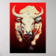 The fiery red tones that dominate the background evoke a sense of passion, energy, and movement, emphasizing the bull's dynamic nature. The play of light and shadow adds depth and dimension, making the image come alive. The bold strokes and fiery palette create an artwork that is both modern and timeless, appealing to those who appreciate strength, motion, and dramatic compositions.