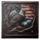 A detailed carving of a majestic eagle perched on a branch, set against a backdrop featuring mountains and the American flag.
