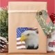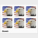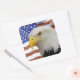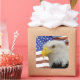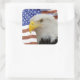 An image of the head of a bald eagle over an American flag waving in a breeze.