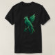 This illustration depicts a majestic eagle-like bird designed with a modern, futuristic aesthetic. The bird’s feathers resemble glowing leaves, symbolising harmony with nature while maintaining a sleek, geometric style. It perches gracefully on a branch, with its sharp eyes looking downward, exuding strength and vigilance. Beneath the branch, a small mouse appears calm and unafraid, highlighting a balance between predator and prey. The deep green background, dotted with subtle glowing particles, enhances the sense of mystery and serenity, giving the artwork a harmonious blend of power, elegance, and natural beauty.