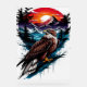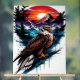 Digital illustration of a red-tailed hawk perched on a blue splattered rock. The hawk has detailed brown and white feathers, yellow talons, and a sharp yellow beak. Behind it, a vibrant sunset with a red-orange sky, silhouetted pine trees, and snow-capped mountains. The background features dynamic brush strokes and splatters, blending realism with abstract art styles. The overall color palette includes rich browns, whites, blues, and reds.