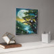 An eagle sits majestically on a tree branch, overlooking a serene river at twilight with a full moon illuminating the landscape.