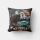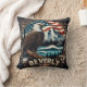 An eagle stands majestically on a log with mountains, waves, and an American flag in the background, representing strength and freedom.