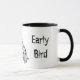 This mug sports a freehand ink drawing of a feathered lizard, reminiscent of Archaeopteryx or Aurornis, with the words "Early Bird" to the right.
