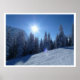 Photograph of a ski slope with the morning sun shining behind the pines.