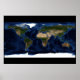 Much of the information contained in this image came from a single remote-sensing device-NASA’s Moderate Resolution Imaging Spectroradiometer, or MODIS. Flying over 700 km above the Earth onboard the Terra satellite, MODIS provides an integrated tool for observing a variety of terrestrial, oceanic, and atmospheric features of the Earth. The land and coastal ocean portions of these images are based on surface observations collected from June through September 2001 and combined, or composited, every eight days to compensate for clouds that might block the sensor’s view of the surface on any single day. Two different types of ocean data were used in these images: shallow water true colour data, and global ocean colour (or chlorophyll) data. Topographic shading is based on the GTOPO 30 elevation dataset compiled by the U.S. Geological Survey’s EROS Data Centre. MODIS observations of polar sea ice were combined with observations of Antarctica made by the National Oceanic and Atmospheric Administration’s AVHRR sensor—the Advanced Very High Resolution Radiometer. The cloud image is a composite of two days of imagery collected in visible light wavelengths and a third day of thermal infra-red imagery over the poles. Global city lights, derived from 9 months of observations from the Defence Meteorological Satellite Program, are superimposed on a darkened land surface map.