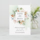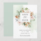 Announce your wedding date with this elegant wedding save the date card with delicate sage green watercolor stains cascading behind gorgeous Save the Date floral frame in a mixture of modern calligraphy and block typography. Floral in a beautiful blend of beige, dusty rose, blush, terracotta, rust, burnt orange, green and a hint of blue hues. Also available in postcard presentation. Back in attractive sage green tone, which can be changed to white or any other colour by selecting "customise further". Also available with back in buttery beige. Part of our "Earthy Blooms in Sage Green and Terracotta" collection with a variety of coordinating products including complete invitation suite.