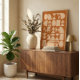 Modern geometric pattern with simple shapes in beige on an earthy terracotta background.