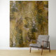 Tropical plants (palm fronds, monstera leaves) pattern in rich earth tones of green, ochre (deep yellow) and browns.