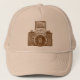 A hat with a high contrast, high passed filtered and vectorised image of a vintage East German camera from the 1950s. Creating a strong bold toothy retro screen print. or mediaeval Gothic brass rubbing like effect.
