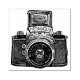 A high contrast, high passed filtered and vectorised image of a vintage East German camera from the 1950s. Creating a strong bold toothy retro screen print. or mediaeval Gothic brass rubbing like effect.