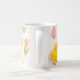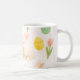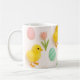 This springtime/Easter holiday coffee mug showcases a charming pattern of baby chicks and bunnies. The design also includes colorful Easter eggs and red tulip flowers.