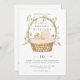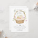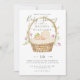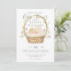 Baby shower invitation featuring a watercolor baby sleeping in an easter basket, decorated with tulips and foliage.