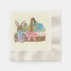 Three newly hatched baby Easter dragons all in an Easter basket with dragon eggs, A stuffed Easter bunny and easter basket wrapped in a pink bow in a backdrop of light yellow
