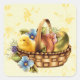This lovely Easter sticker features an elegant gold Easter basket filled with beautiful painted eggs, flowers and a sweet yellow chick. The background is yellow with a simple floral.