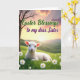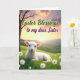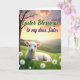 This greeting card shows a young white lamb resting in lush green grass, its gentle gaze angled slightly upward as if sharing a quiet moment with someone close 🌷. Small white, daisy-like flowers dot the foreground and guide your eye toward the center where the lamb’s soft fleece is shaded with light cream tones. Behind it, rolling hills fade into the distance under warm golden light that suggests early morning or late evening. The sky blends peach, lavender, and soft orange, with thin clouds catching the glow near the horizon. A leafless tree rises along the left side, its branching silhouette adding a calm frame to the scene. Across the upper area, the message “Easter Blessings to my dear Sister” appears in flowing lettering, with some words in green and others in purple, standing out clearly against the sky 🐇. The grass is richly textured, and the lamb’s curled legs and relaxed posture sit among scattered white blooms.