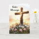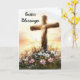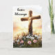 This Easter card features a serene and uplifting image of a wooden cross standing tall amidst a field of blooming wildflowers. The cross is illuminated by the soft, golden light of a sunrise, symbolising hope and renewal. The flowers, including daisies and other colourful blossoms, add a touch of natural beauty and joy to the scene, making it a perfect representation of the Easter season.