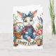 An adorable Easter-themed illustration featuring a cute bunny dressed in denim overalls and a red plaid shirt. The bunny has large ears with a soft pink inner tone, a sweet expression, and a big blue bow tied on its head. Surrounding the bunny is a festive arrangement of pastel-coloured Easter eggs, a basket, spring flowers, and butterflies. A ribbon at the bottom displays the message "Happy Easter."
