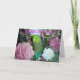 This Easter greeting card shows a male green parrotlet sitting among a bouquet of Easter flowers