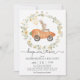 Hop on over for an Easter brunch and egg hunt! Invite your guests to your party with this super adorable invitation featuring a cute rabbit riding a carrot car framed with lush wildflower wreath.