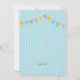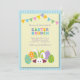 An invitation to Easter brunch, in beautiful pastel colours, featuring a bunny coming out of his burrow with Easter eggs and colourful flags against a blue striped background.