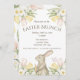 Easter brunch invitation card with a soft, pastel-coloured design. The card features floral arrangements of pink tulips, yellow daffodils, and white flowers adorning the top and bottom edges. An illustration of a brown rabbit holding a carrot is placed at the bottom, surrounded by the floral elements. Customisable details centred on card and pastel floral design repearted on reverse.