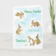 An Easter Card for a teacher with rabbits hiding Easter Eggs, from a watercolour painting by Judy Adamson. Blank inside for your own message.