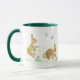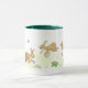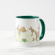 A white mug with a dark green handle and lip with a design of Easter Rabbits hiding Easter Eggs, from a handpainted design by Judy Adamson.