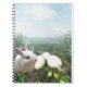 Under a soft blue sky, a cute white Easter bunny checks out a nest of blue, pink and yellow Easter eggs, nestled in the long grass.
