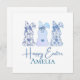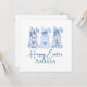 Personalised name "Happy Easter" Three funny bunnies in gradient blue, floral in blue and white will make it great Easter gift.