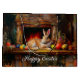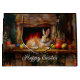 Easter bunny lounging in front of the fireplace with colourful Easter eggs