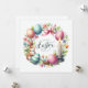 This image is an Easter-themed illustration that features a bunny holding a striped Easter egg, sitting amidst a wreath of colourful flowers, greenery, and decorated Easter eggs. A pink bow adorns the top of the wreath, adding a celebratory touch. A lit candle on the right side complements the cosy, festive atmosphere. In the centre, the text "Happy Easter" is displayed in elegant, flowing typography.