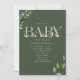 Easter baby shower theme with "BABY" text in beige surrounded by eucalyptus greenery, rabbits, and Easter eggs. Background is dark green on front. Reverse side is beige.